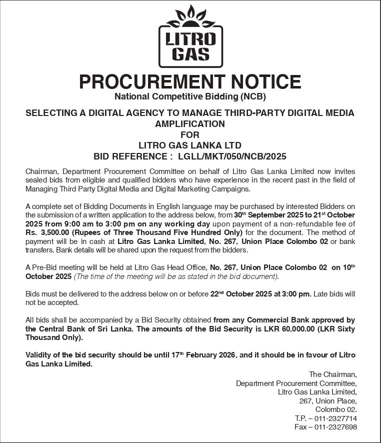 PROCUREMENT NOTICE FOR THE SUPPLY OF LIQUEFIED PETROLEUM GAS (LPG) TO LITRO GAS LANKA LIMITED FOR THE YEAR 2026